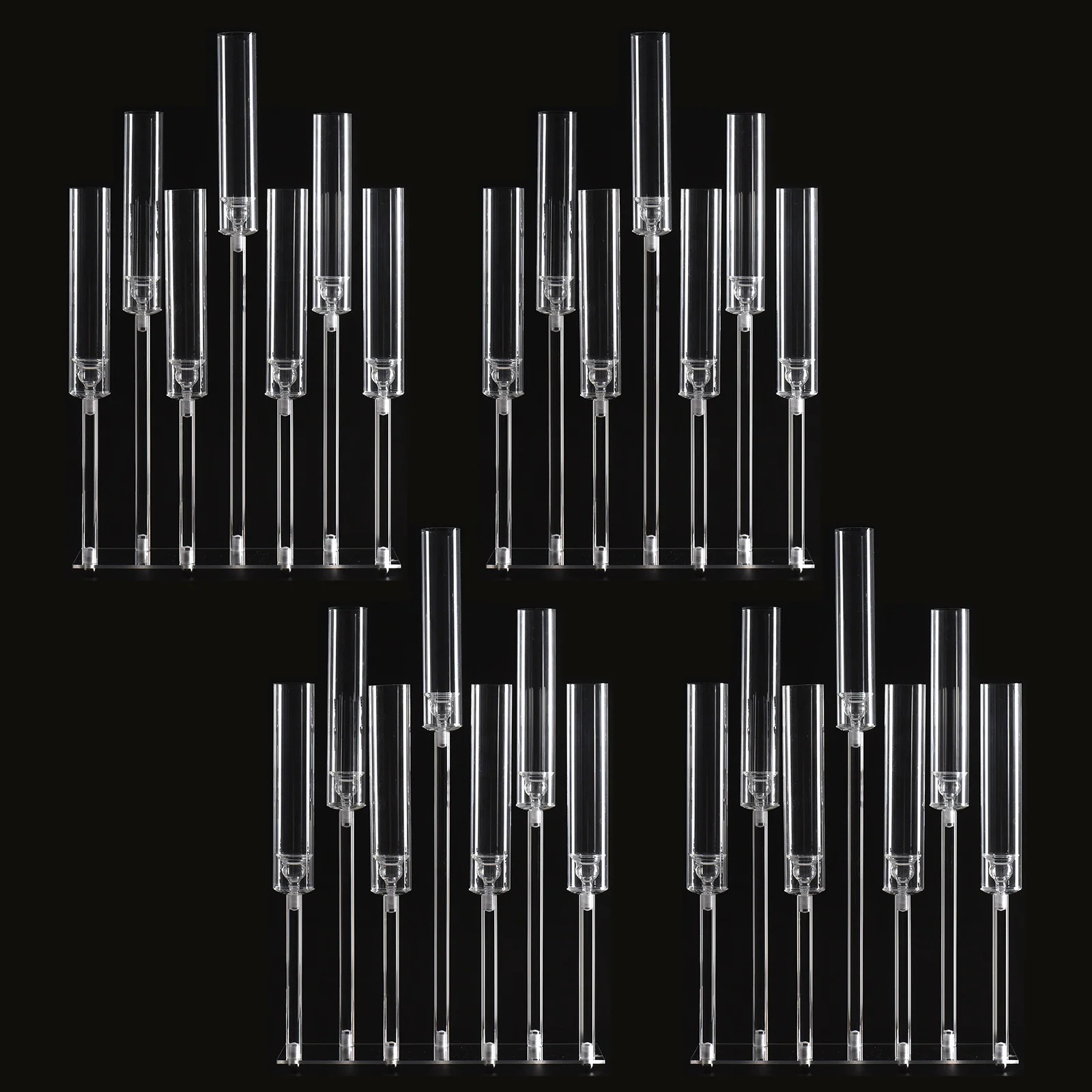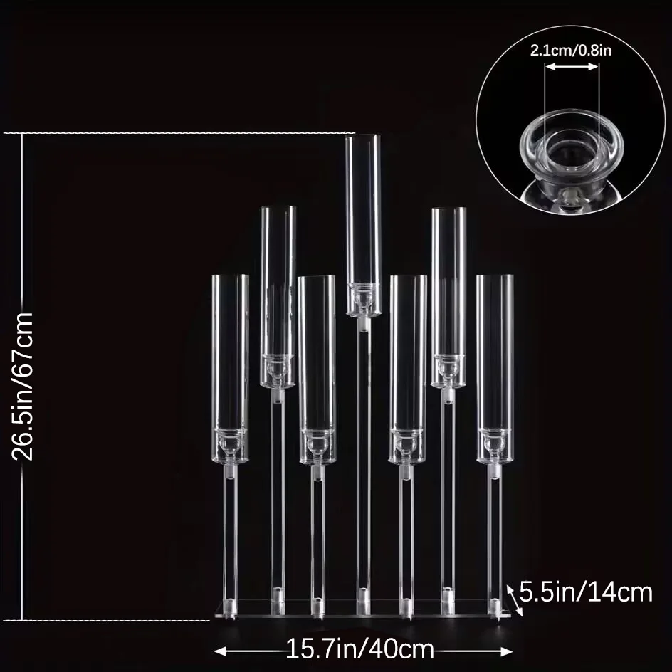 Elevate your décor with the Acrylic 7-Arm Candle Holder Set, a stunning 4-piece collection designed to bring sophistication and sparkle to any event or living space. Standing 26.5 inches tall, each clear candelabra features seven elegant arms that beautifully hold candles, casting a warm, romantic glow across the room. Crafted from premium clear acrylic, these candle holders combine the luxurious look of crystal with lightweight durability, making them perfect for weddings, birthdays, banquets, or formal dinners. Their modern yet timeless design complements any theme — from classic elegance to contemporary style. Ideal for use as a table centerpiece or decorative accent in living rooms, dining areas, or event halls, they add a touch of grandeur and charm to every setting. Easy to assemble and clean, the Acrylic 7-Arm Candle Holder Set is the perfect choice for creating a memorable atmosphere at any celebration or home gathering.